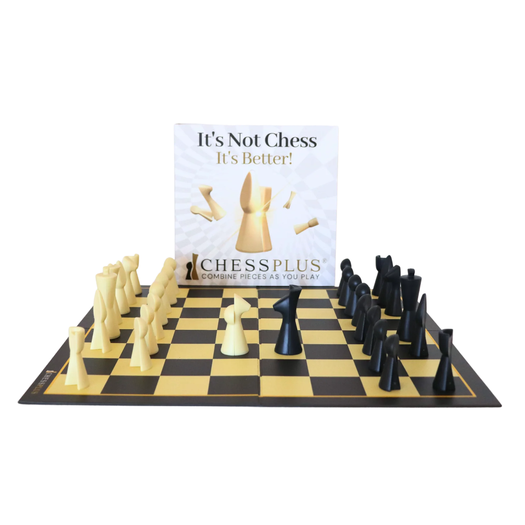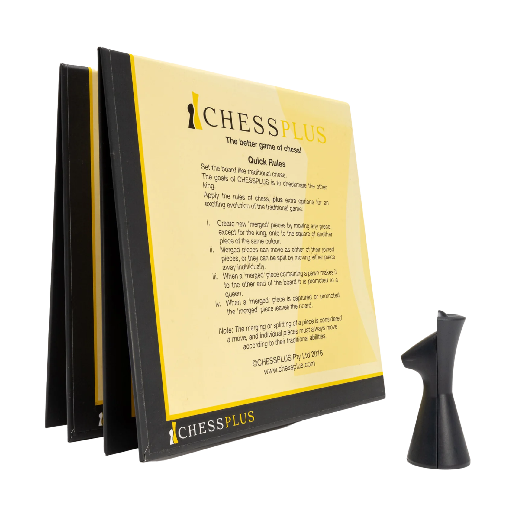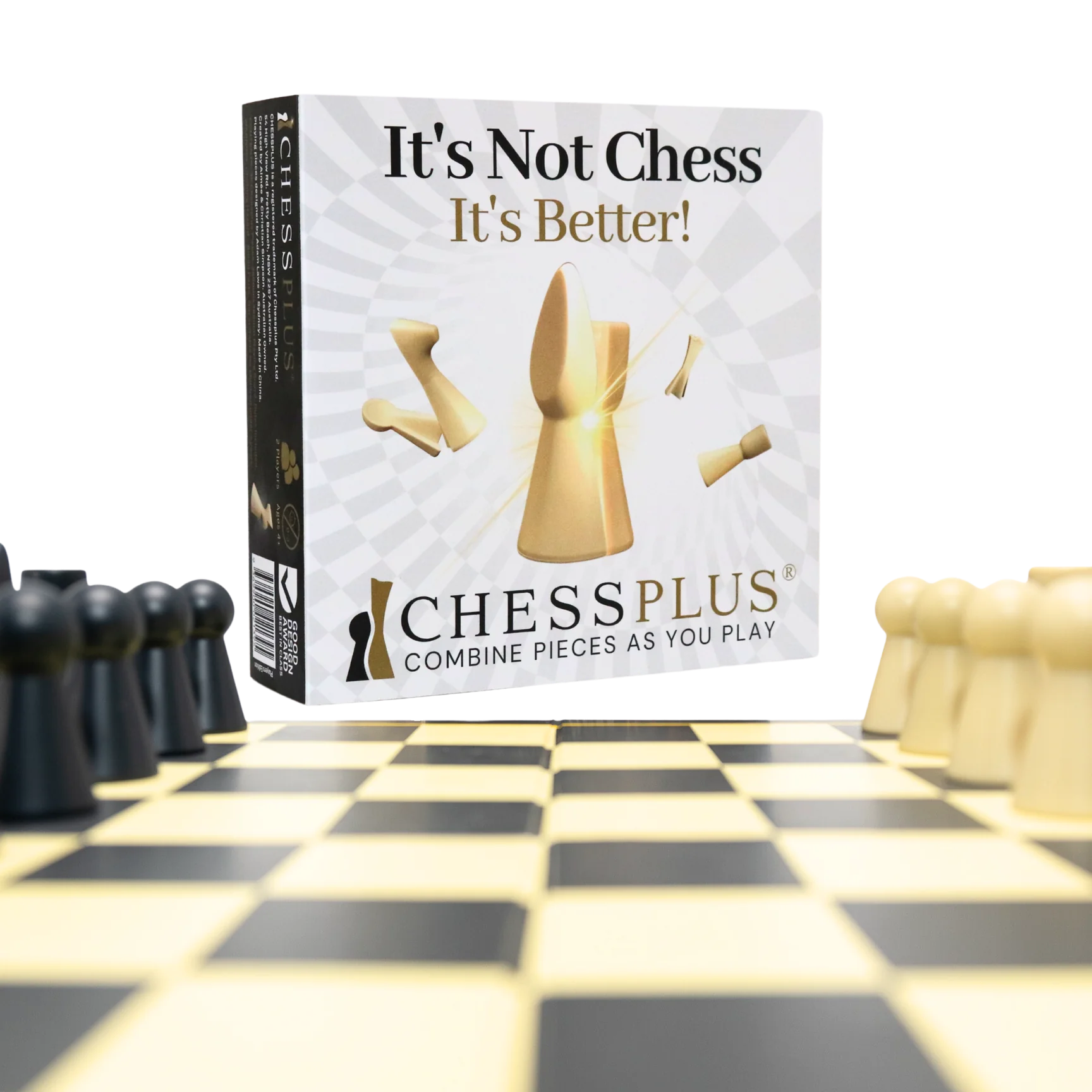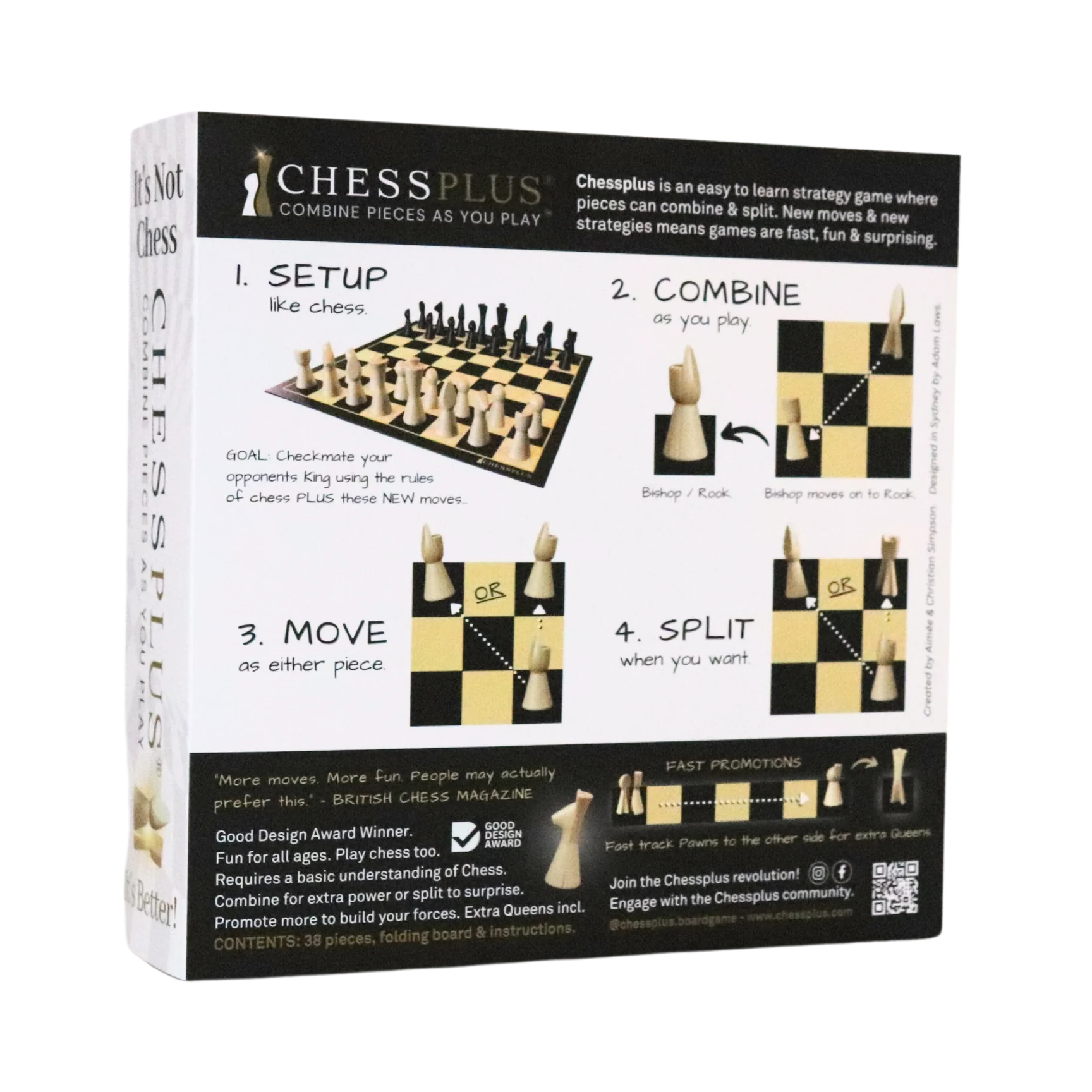Das Design zollt den Traditionen des Schachfigurendesigns Tribut und verfügt über ein ineinandergreifendes Designmerkmal, das ein doppeltes Spiel von Chessplus UND Schach ermöglicht.